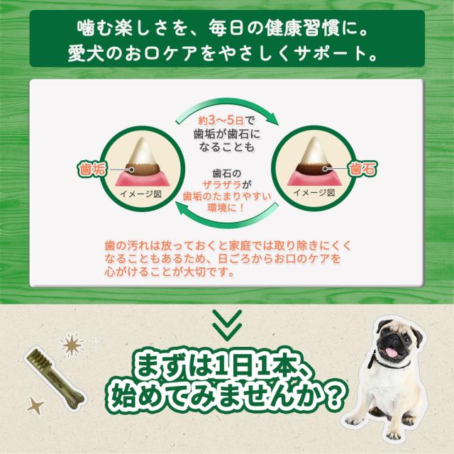 | 商品説明 | 1日1本噛んで、歯垢と口臭をしっかりケア! わんちゃん思いの設計で、オーラルケアが、毎日したくなる触れ合いと笑顔の時間に。 わんちゃんの歯に配慮したやわらかさ しっかり食い込んで歯垢を落とす※噛むことにより わんちゃんは硬い物であっても楽しそうに噛むことがありますが、人間と同じように歯に配慮して、適切なやわらかさの歯みがきガムを選んであげることが大切です。 こだわりの自然素材を使用 わんちゃんが夢中になるおいしさ* 栄養強化のため、合成ビタミン、ミネラル、アミノ酸使用。着色料使用。 すぐれた栄養バランス 総合栄養食基準適合。 抜群の消化性 健康的な消化吸収に配慮。溶解性の高いタンパク質使用。 こんな方におすすめです。 ・口臭が気になる超小型犬の愛犬に ・愛犬の日頃の口腔ケアを手軽に済ませたい方に |