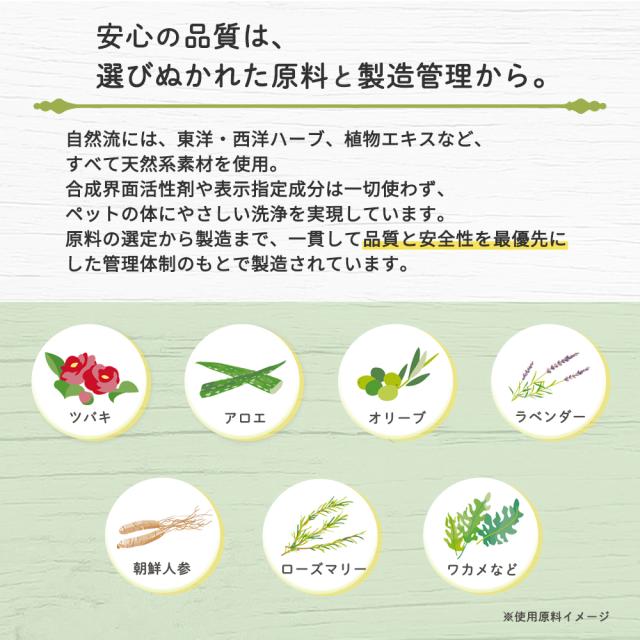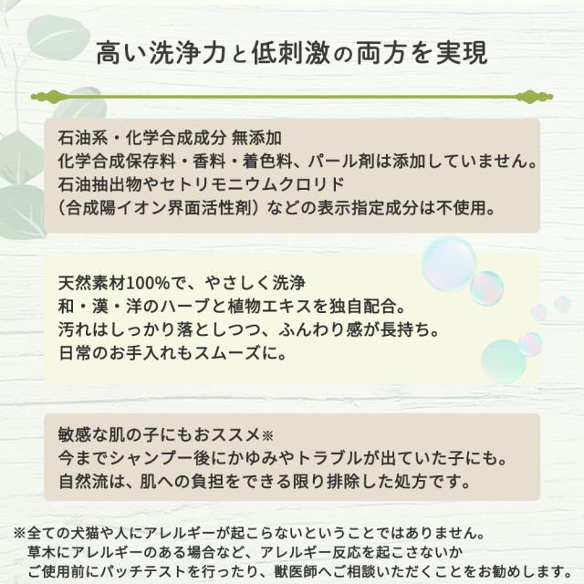 ※シャンプー後、皮膚、被毛、手肌に多少ヌルヌル感が残りますが、これは天然系保湿剤や漢方エキスなどによる、積極的保護作用によるものです。
