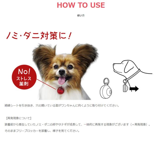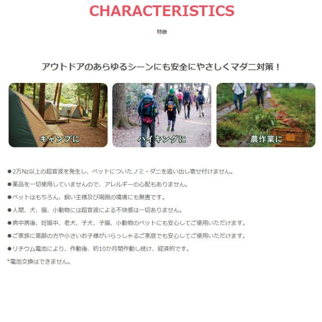 薬品を一切使用せず20,000Hz以上の超音波を発信してペットに付いたノミ、ダニを追い出し、寄せ付けません!約10ヶ月間作動し続けます。