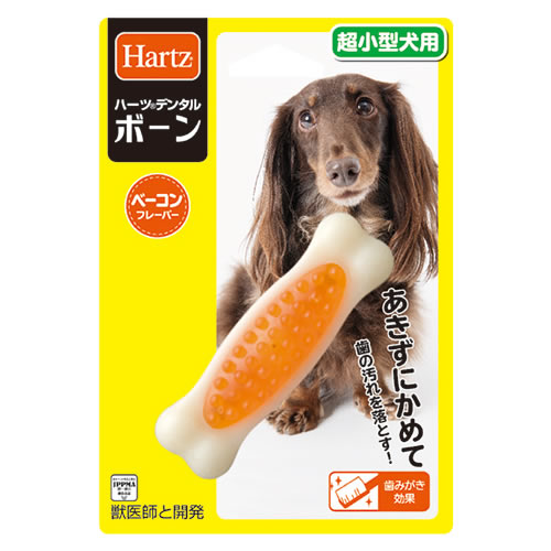 獣医師との共同開発。みんなが大好きな骨形デンタルトイ。噛み応えのあるプラスチック素材。ベーコンフレーバー。