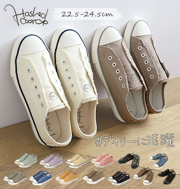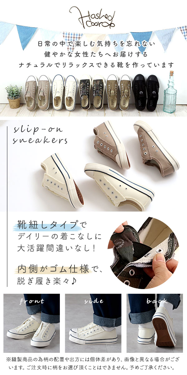 スリッポン レディース スニーカー シューズ 紐なし おしゃれ かわいい 靴 シンプル フラット ローカット キャンバス Hashed Coorde ハッシュドコーデ HC1636F カジュアル 旅行 疲れにくい 婦人靴