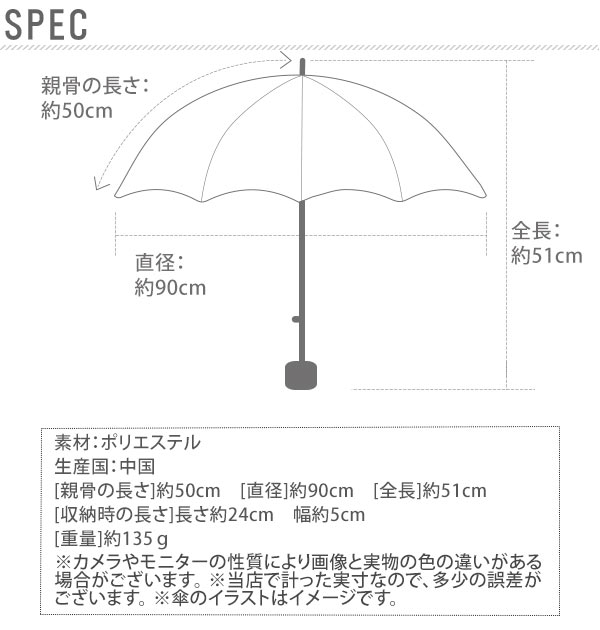 | サイズ | [親骨の長さ]約50cm [直径]約90cm [全長]約51cm [収納時の長さ]長さ約24cm 幅約5cm ※サイズは当店平置き実寸サイズです。実際の商品とは多少の誤差が生じる場合がございます。あらかじめご了承ください。 |