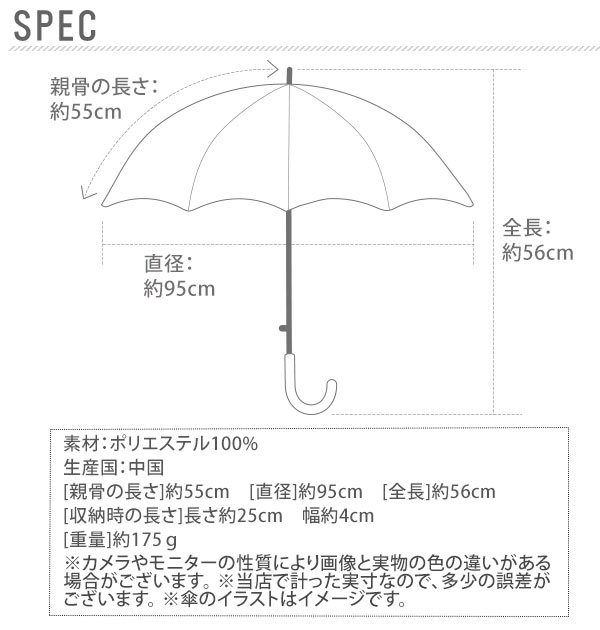 | サイズ | [親骨の長さ]約55cm、[直径]約95cm、[全長]約56cm [収納時の長さ]長さ:約25cm、幅:約4cm ※サイズは当店平置き実寸サイズです。実際のサイズと多少の誤差が生じる場合がございます。ご了承ください。 |