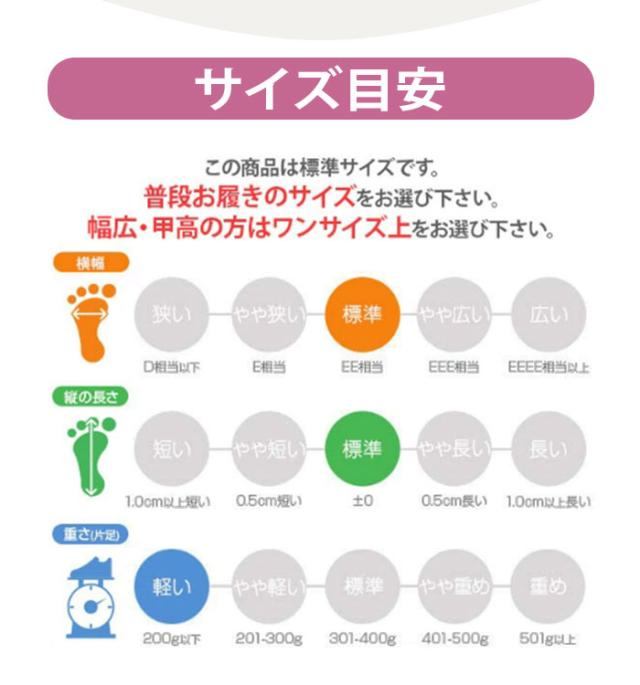 | サイズ | サイズS:21.5-22.0cm サイズM:22.5-23.0cm サイズL:23.5-24.0cm |