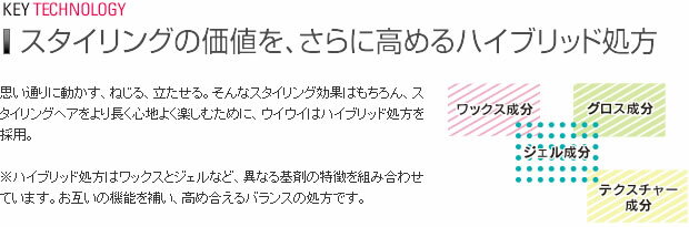 ワックスにジェルの硬さ、ジェルにグロスのツヤ、ジェルにテクスチャーの風合いなど、1本でダブルのスタイリング効果が得られます。