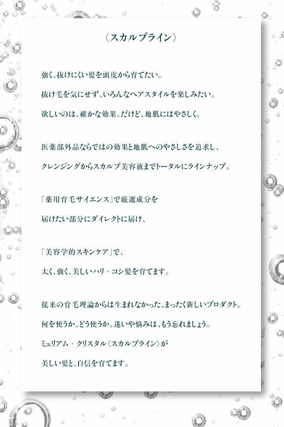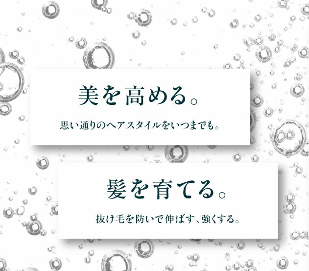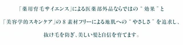 「薬用育毛サイエンス」による医薬部外品ならではの効果と「美容学的」の8素材フリーによる地肌への優しさを追求し、抜け毛を防ぎ、美しい髪と自信を育てます。