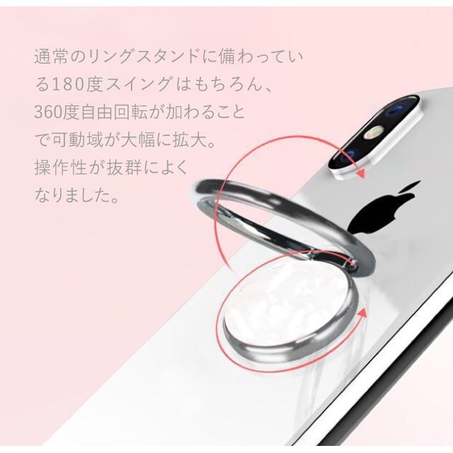 - リングは思ったより大きめです。 指の小さい人は凄く大きいと思います。 360℃回転とは回転ありましたがリングスタンドと書いてあったので、多少は立つかと思い購入しましたが全く立ちません。