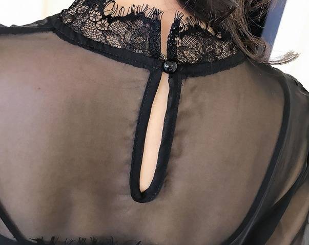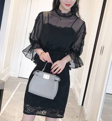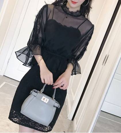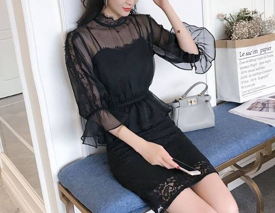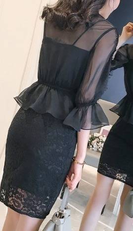 パーティードレス ワンピース&トップス 花柄 黒 レース 七分袖 チュール フリル パフスリーブ ミニ丈 ペプラム ハイネック タイト