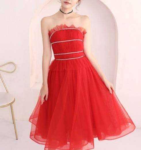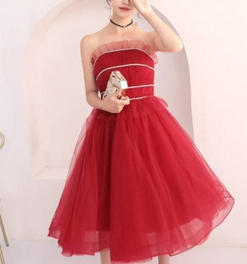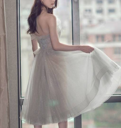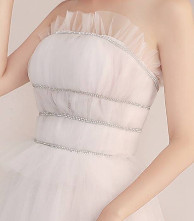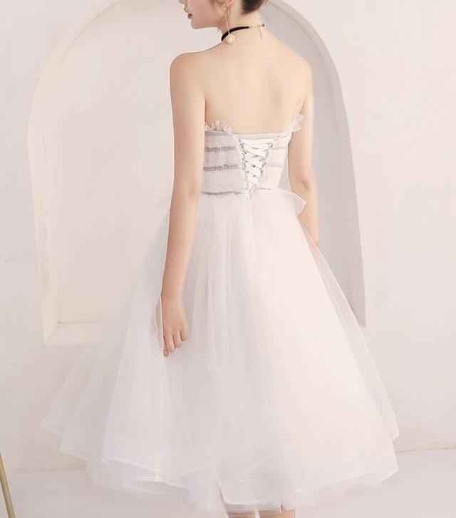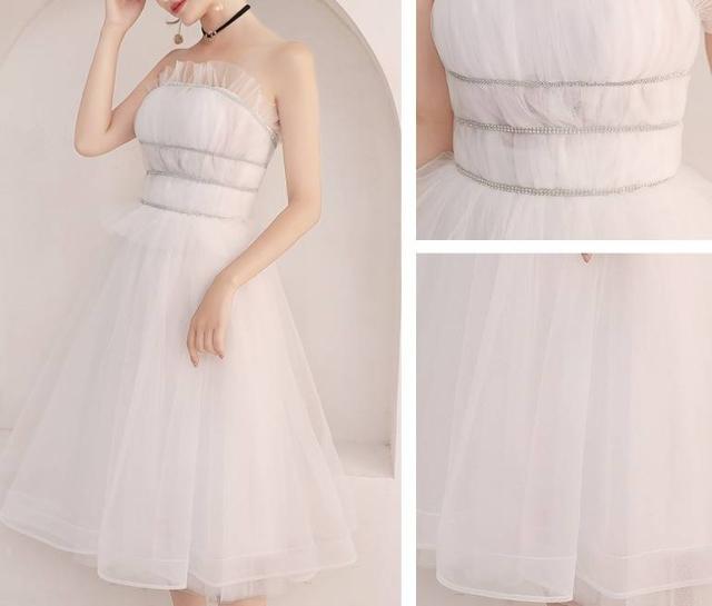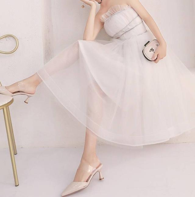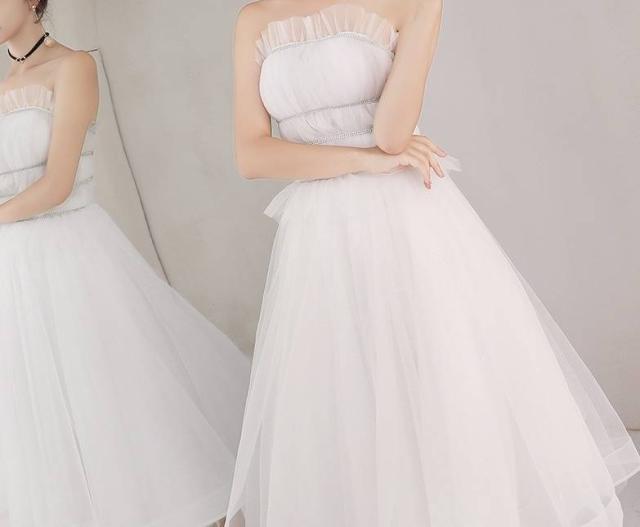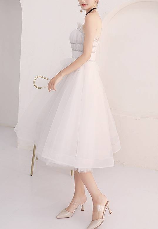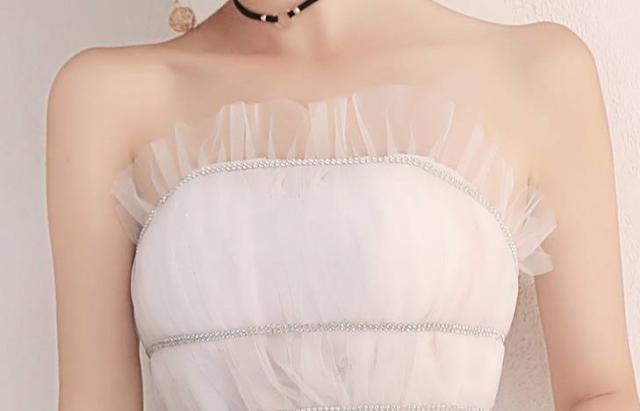 パーティードレス ウエディングドレス 春夏 結婚式 花嫁 マリアージュ ホワイト 大きいサイズ ひざ下丈 ミモレ丈 チューブトップ 袖なし Xライン フレア シフォン 透け感 グリッター ラインストーン ハートカット 20代 30代 フェミニン ガーリー
