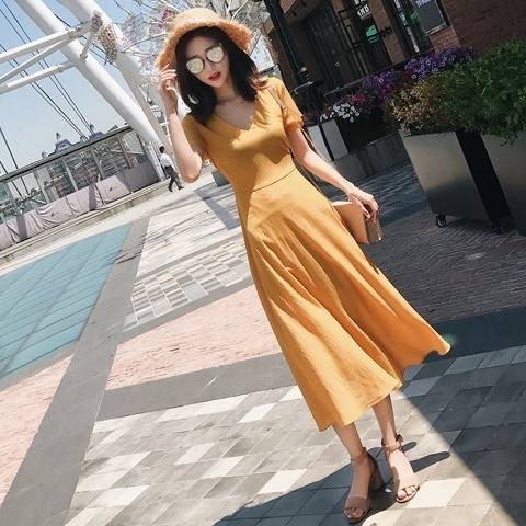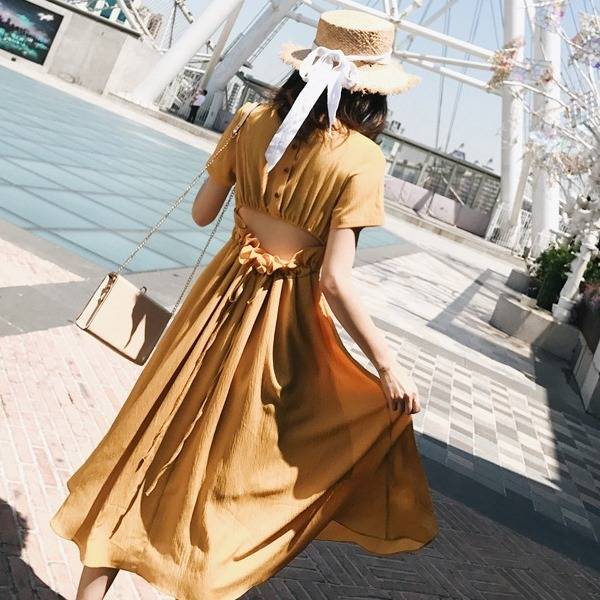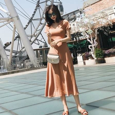 Vネック バックシャン ロングフレアドレス ひざ丈 無地 ワンカラー 半袖 シンプル 上品 エレガント 大人レディ レディース 2018年新作