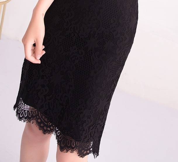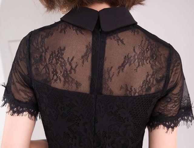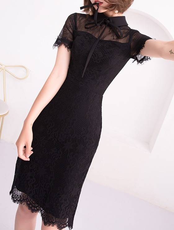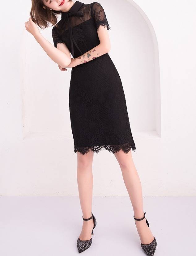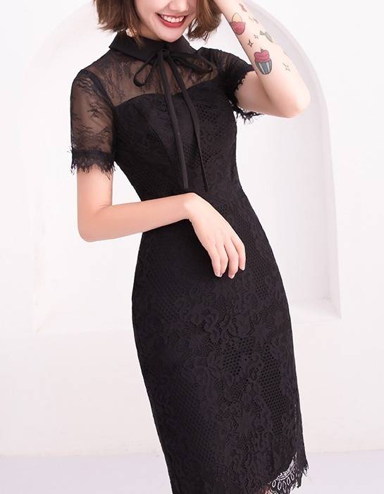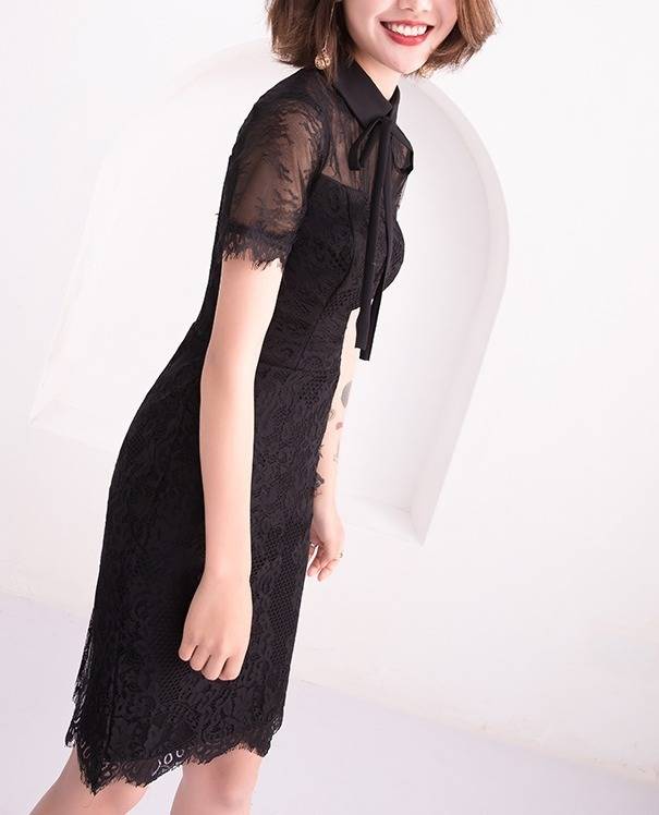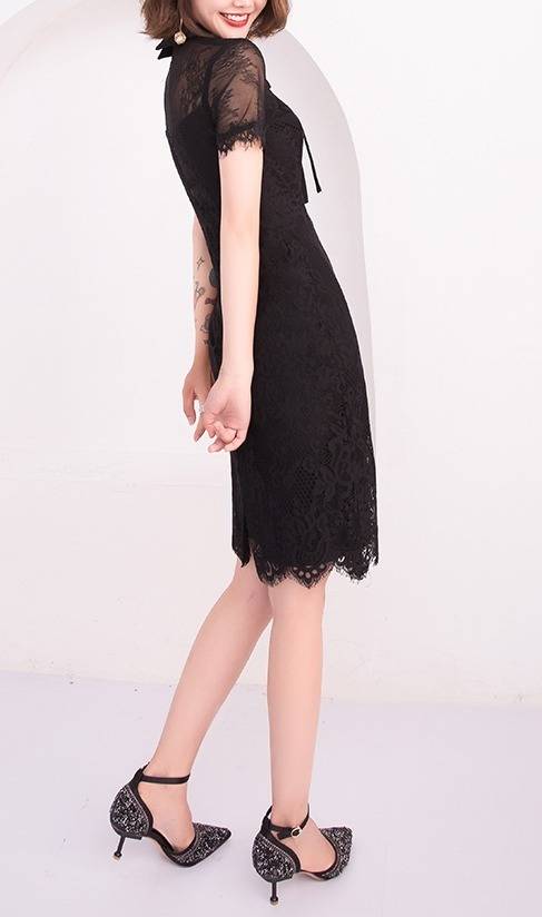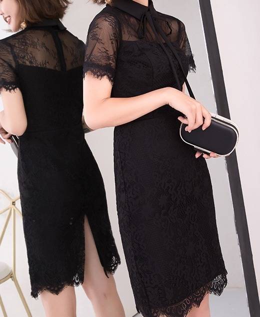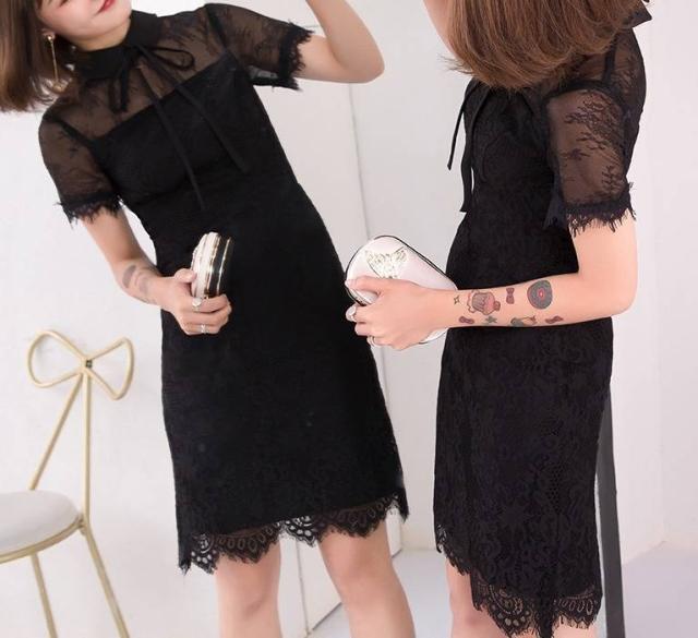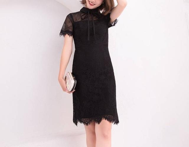 ワンピース フォーマル 黒 パーティードレス 花柄 レース 袖あり スリット 半袖 ミニ丈 タイト リボンタイ パーティー 結婚式 二次会