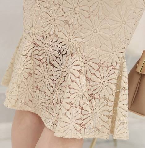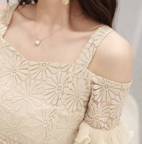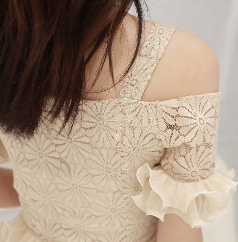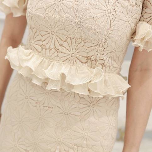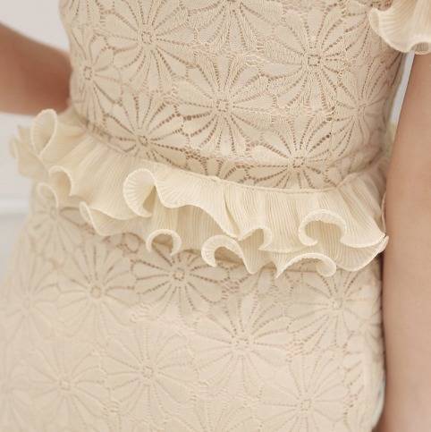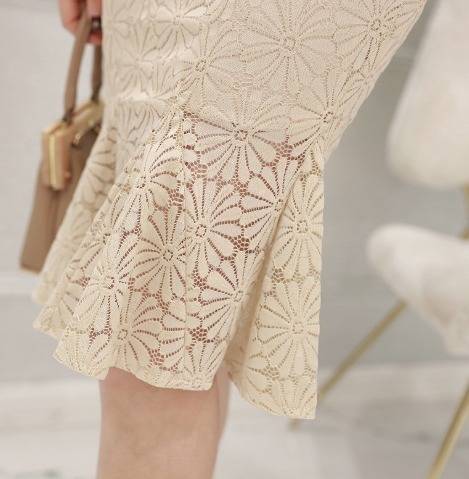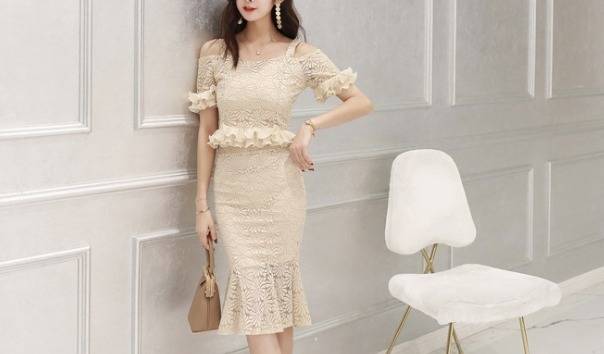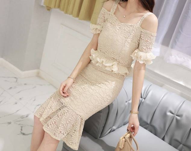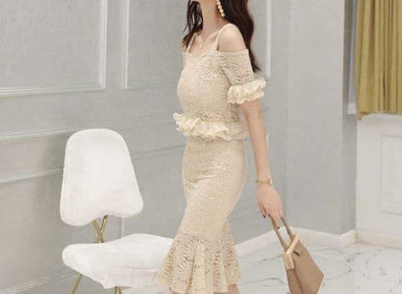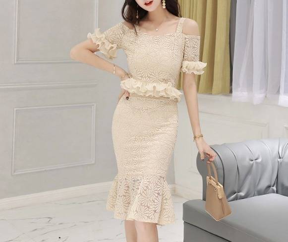 トップス&マーメイドスカート セットアップ ツーピース レース フリル スリム オープンショルダー 膝丈 ミディ丈 タイト 無地