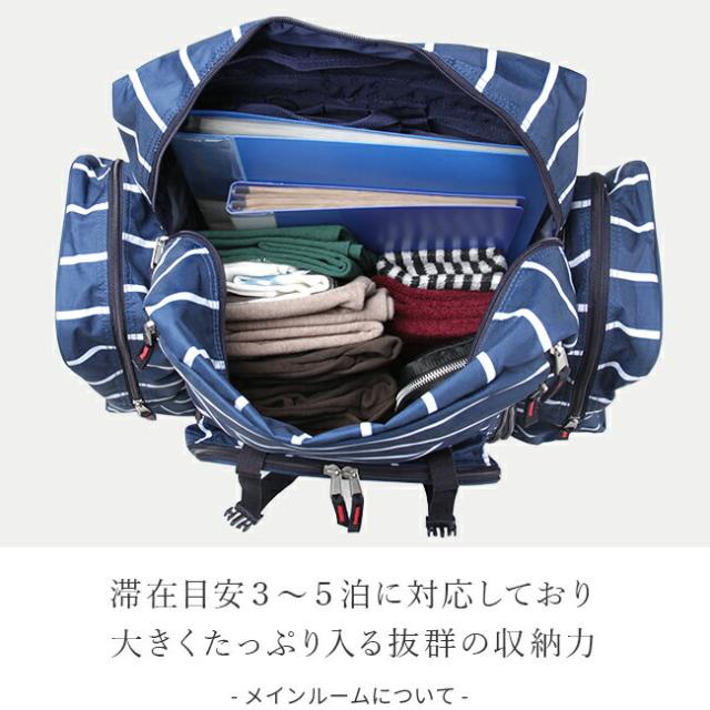 メインルーム内部には、最大B4ファイルサイズが収納可能です。リュックの深さがあるので、厚めの本、ポーチ、タオルなどたっぷり収納してもまだまだ余裕があります。3〜5泊に対応しているので、学校関係のイベントや合宿、帰省などはもちろん、旅行で大活躍してくれること間違いなしです。