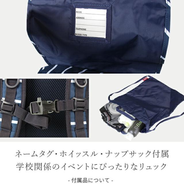かぶせの裏部分にネームタグが付いているので紛失防止になって、とても便利です。メインルーム内部にマジックテープで着脱可能なナップサックが付属しています。さらにチェストベルト部分には緊急時に居場所を知らせるホイッスルが付いています。