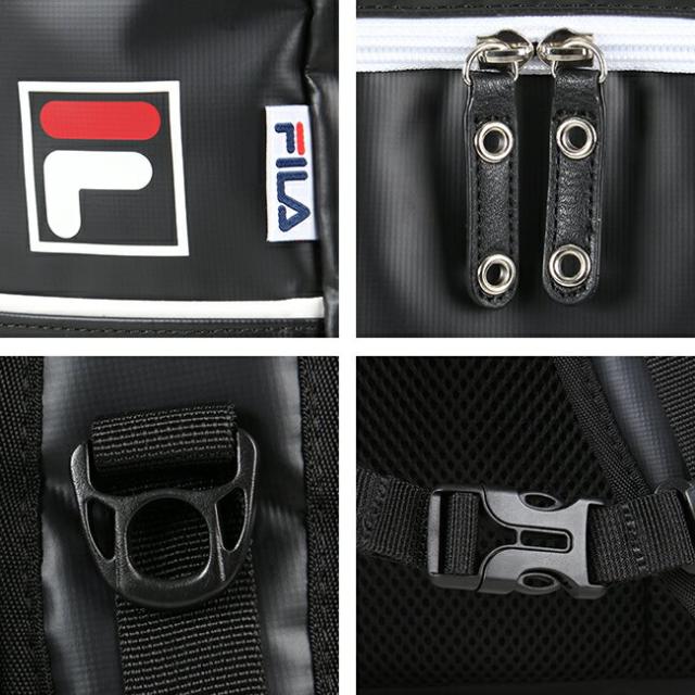 | スポーツブランドFILAのリュックサック。メインルームはA3サイズが収納可能な大容量サイズで、素材に防水・防汚に優れたターポリンを使用したスポーティー&スタイリッシュなデザインです。(完全防水ではありません。)背面パネル、ショルダーベルトには通気性・クッション性あるメッシュ素材を使用しており、快適な背負い心地です。 |
