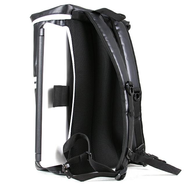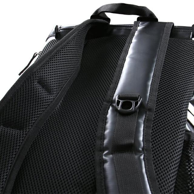 | 背面にはパッド入りメッシュ素材を使用。さらりとした感触で背負った際の汗蒸れや衝撃などの負担を軽減します。 |