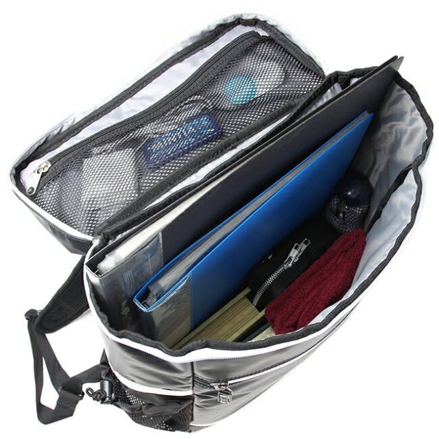 | バッグ上部に長財布などが入るファスナーポケットと、正面にA4ノートサイズがぴったり入るファスナーポケット、サイドに500mlペットボトルが入るメッシュポケット、反対側には定期入れなどの小物が入る縦型ファスナーポケットがあります。 |