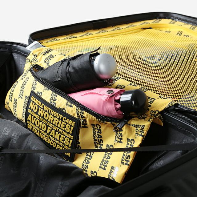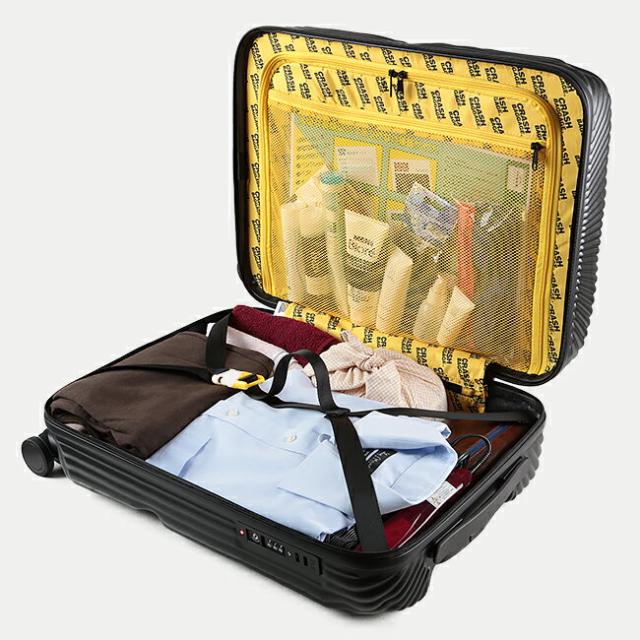 内装はクラッシュバゲージ(CRASH BAGGAGE)らしい派手なデザインですが、構造は至ってシンプル。ユーザビリティに特化した設計になっています。ケース蓋側はラウンドタイプの中仕切りで荷崩れをしっかり防止。ケース本体側はクロスベルトで荷崩れを防止しながらもある程度自由度の高い収納を可能にしました。