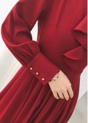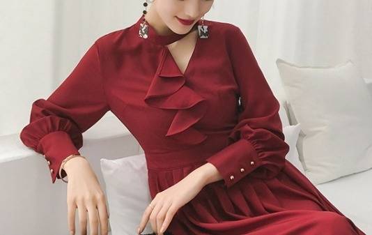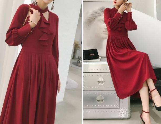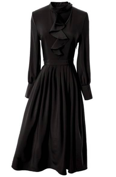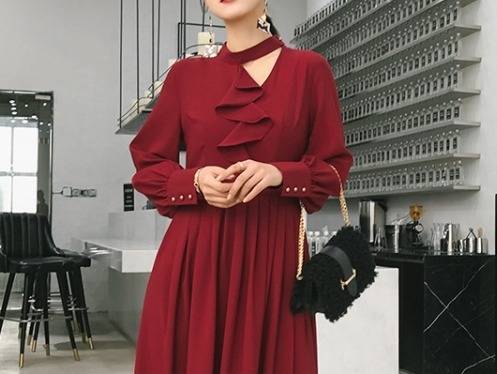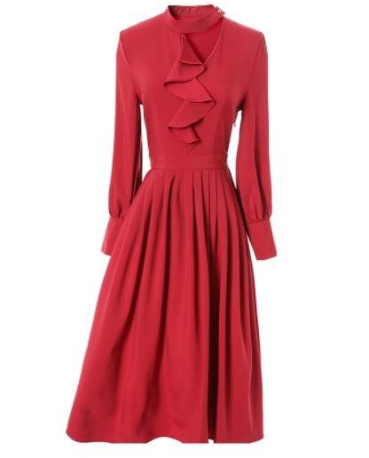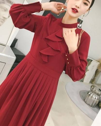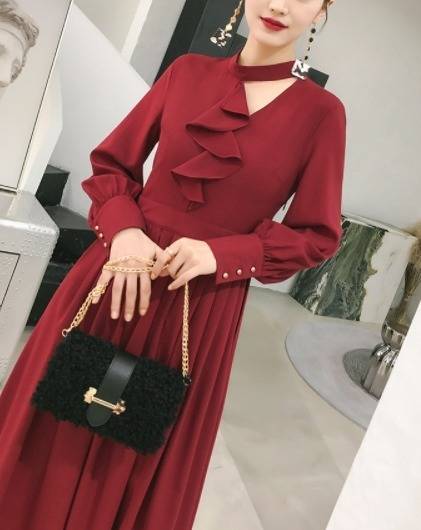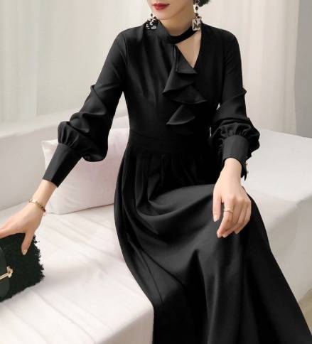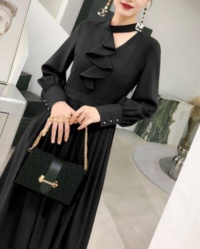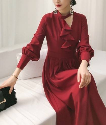 パーティードレス エレガント 非対称 Aライン2色 ミモレ丈 フリル ホルターネック 無地 長袖 パーティー 結婚式 二次会 お呼ばれ