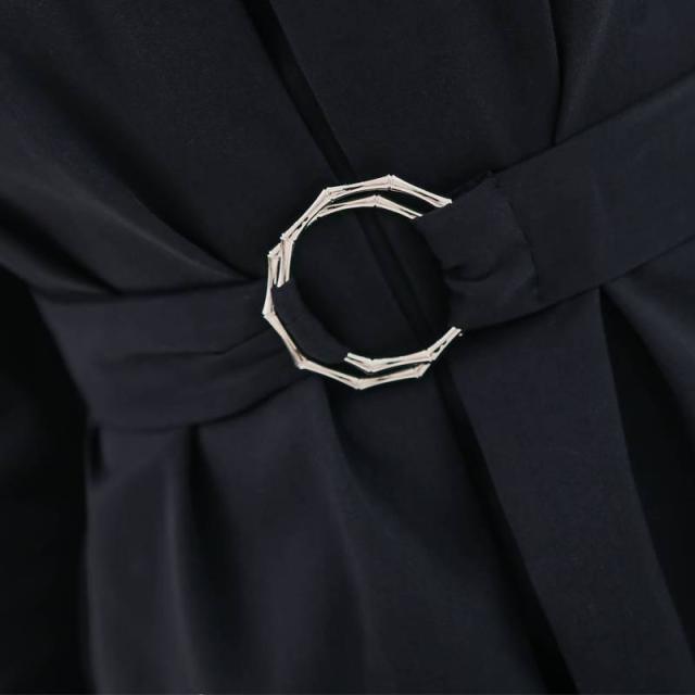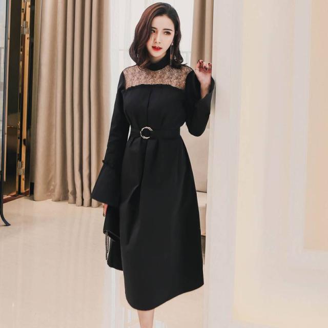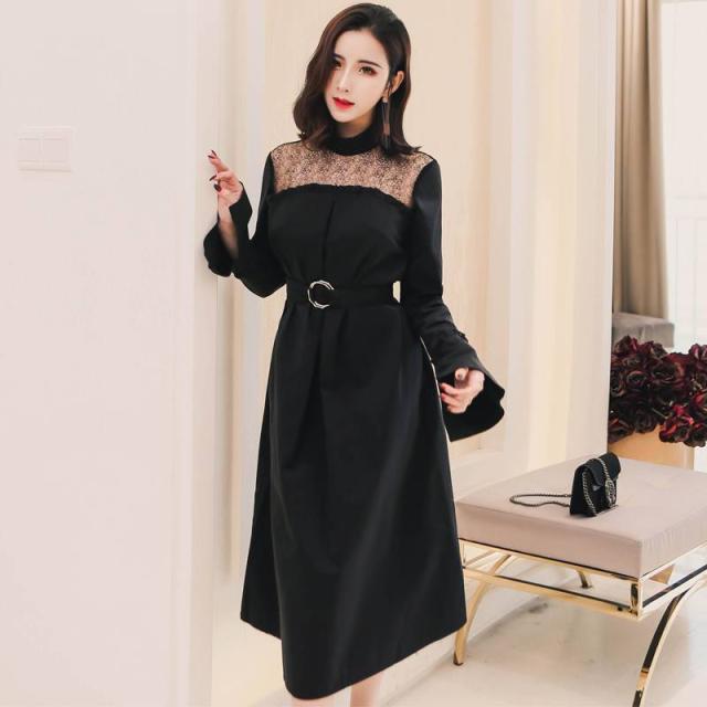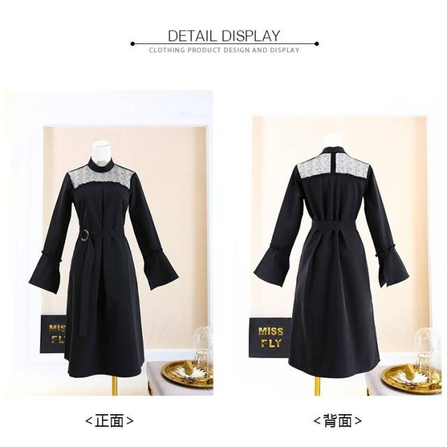 ハイネック 無地 シンプル ワンカラー フレアスリーブ ウエストベルト ロングフレアドレス レディース 2018年新作 定番 人気