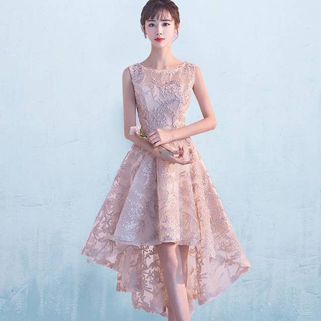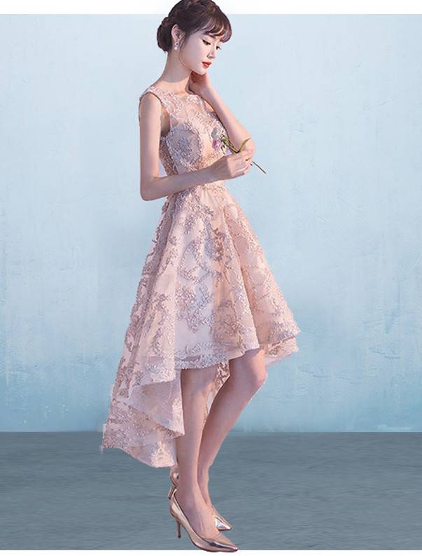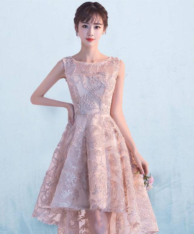 フィッシュテール ノースリーブ フラワーレース ピンク パーティドレス レース テールカット ハイウエスト ミニ丈 フェミニン