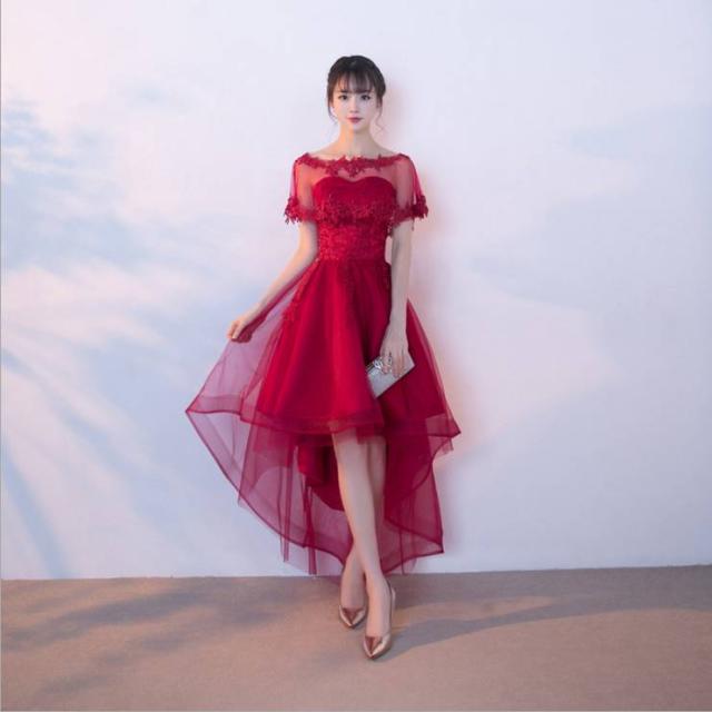 ロングドレス 赤 パーティードレス イブニングドレス 春夏 結婚式 二次会 披露宴 レッド 大きいサイズ ロング丈 ひざ丈 半袖 袖あり Aライン Xライン フレア 刺繍 レース 花柄 透け感 シースルー オフショルダー 20代 30代 フォーマル フェミニン ガーリー