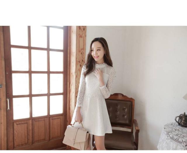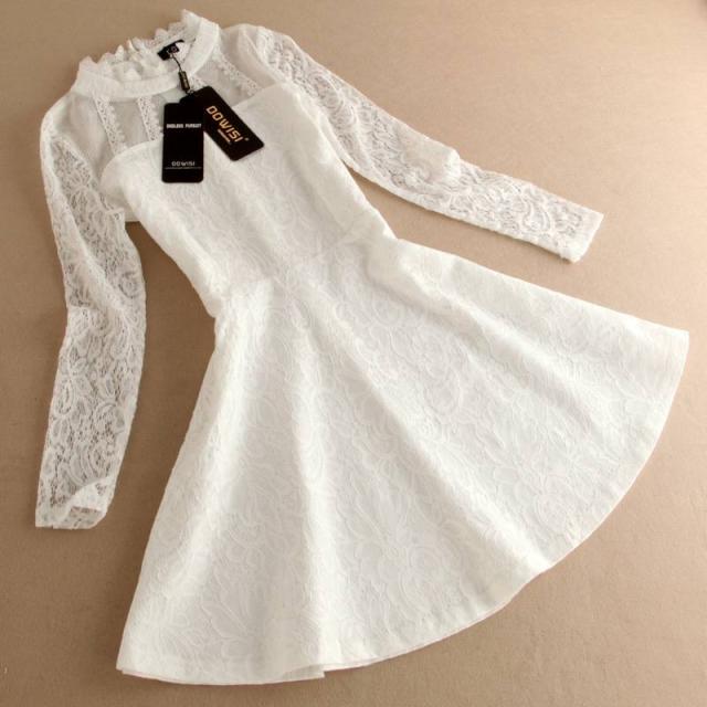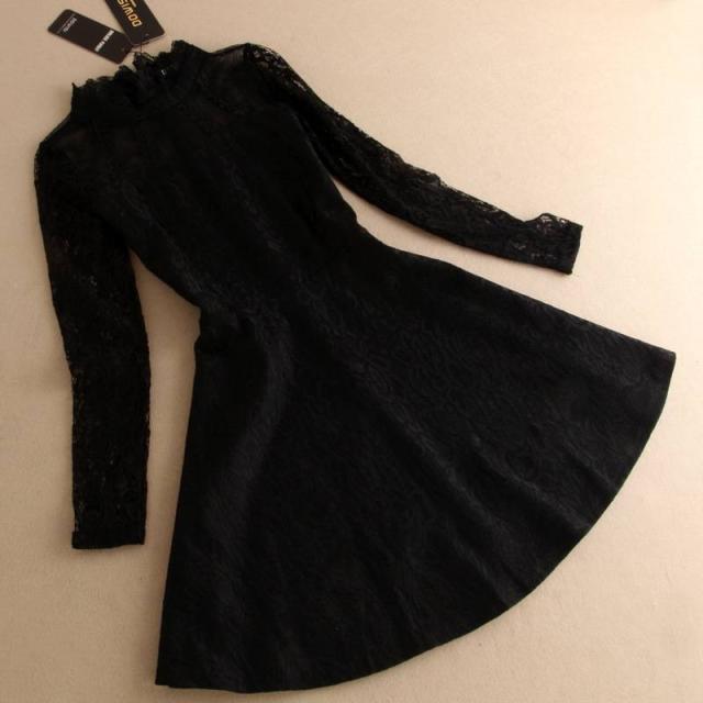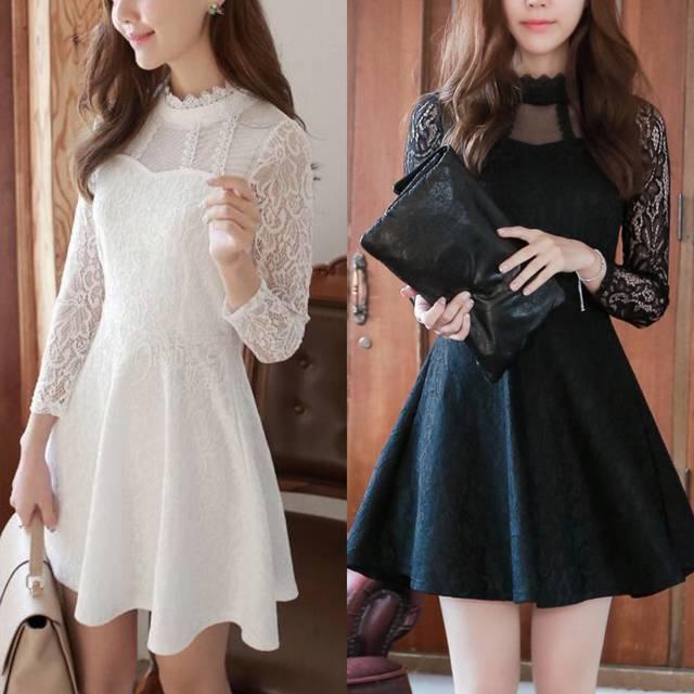 レース 長袖 ハイネック ショートドレス ハルネック ハイウエスト フレア ミニ丈 上品 清楚 シック レディース 2018年新作 定番