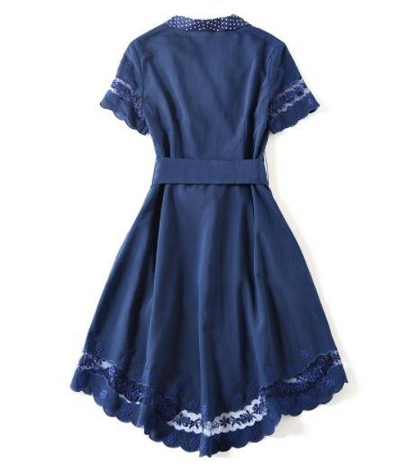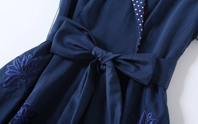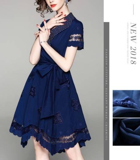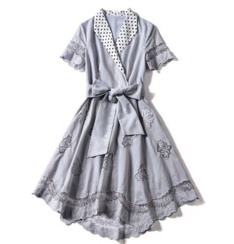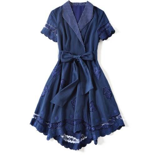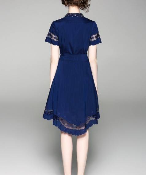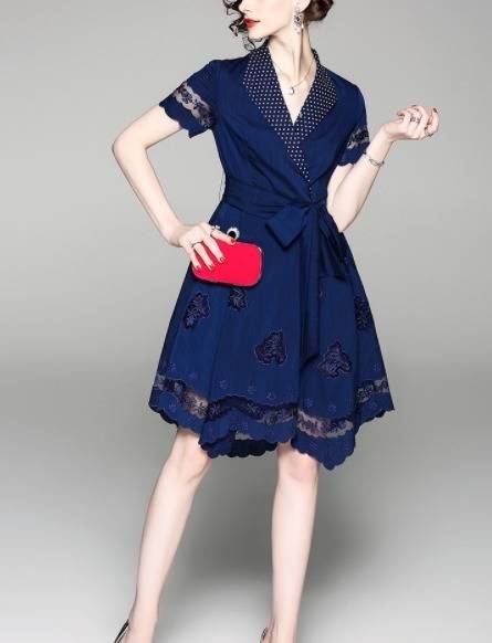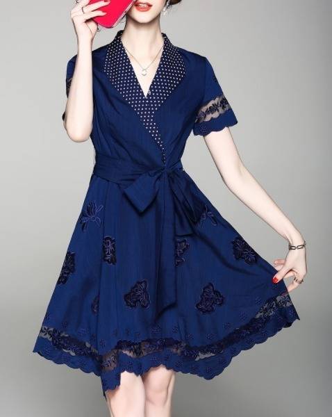 パーティーワンピース 2色 レース ドレス ?ネック半袖 リボンベルト ドット 膝丈 カシュクール 襟付き エレガント パーティー 結婚式