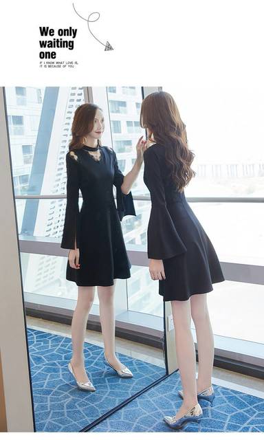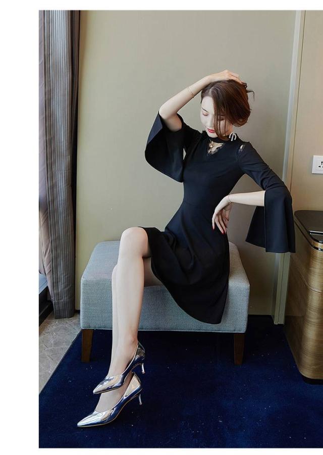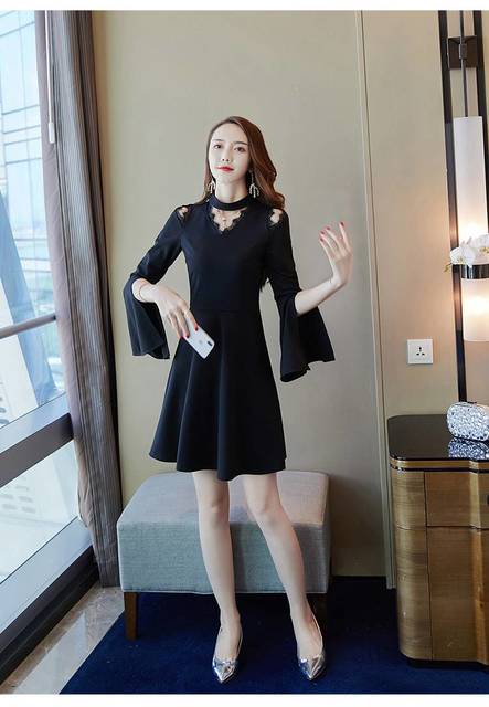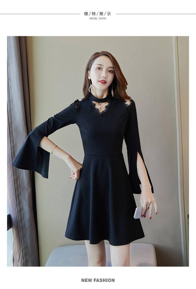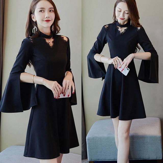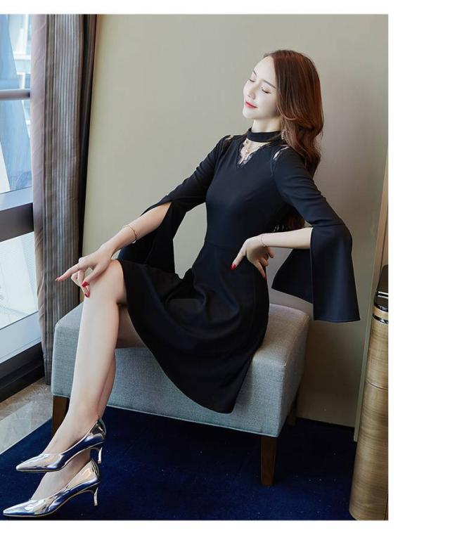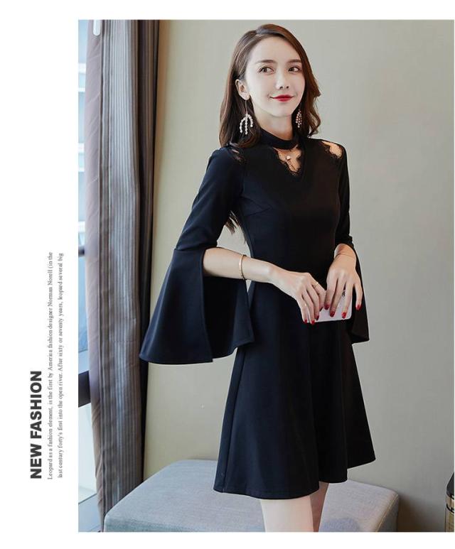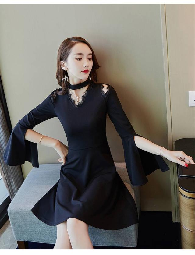ホルターネック 長袖 フレア袖 Aライン ショートドレス ワンカラー シンプル ワイドスリーブ 上品 大人レディ エレガント 無地 ミニ丈