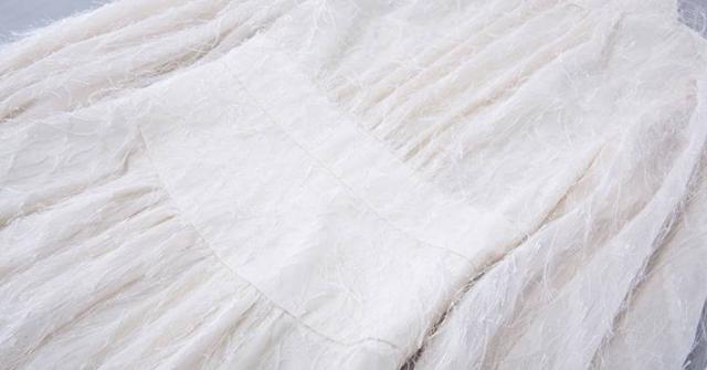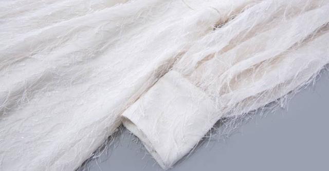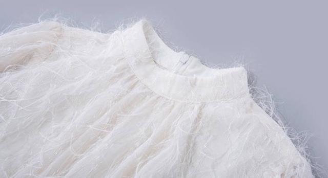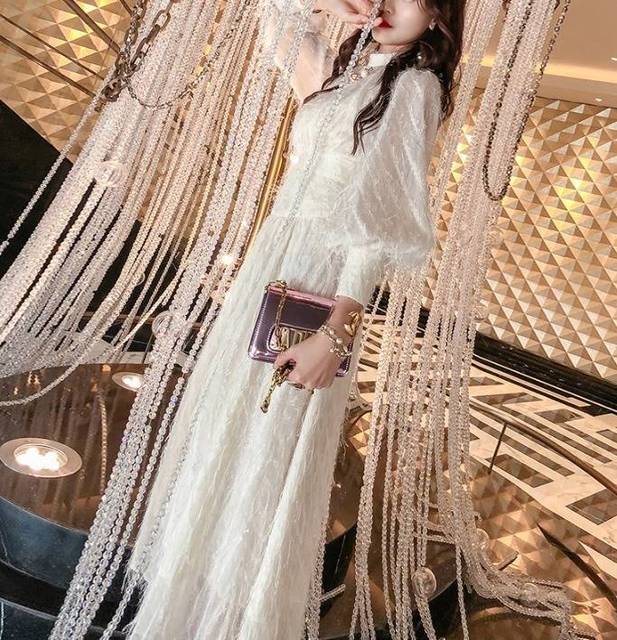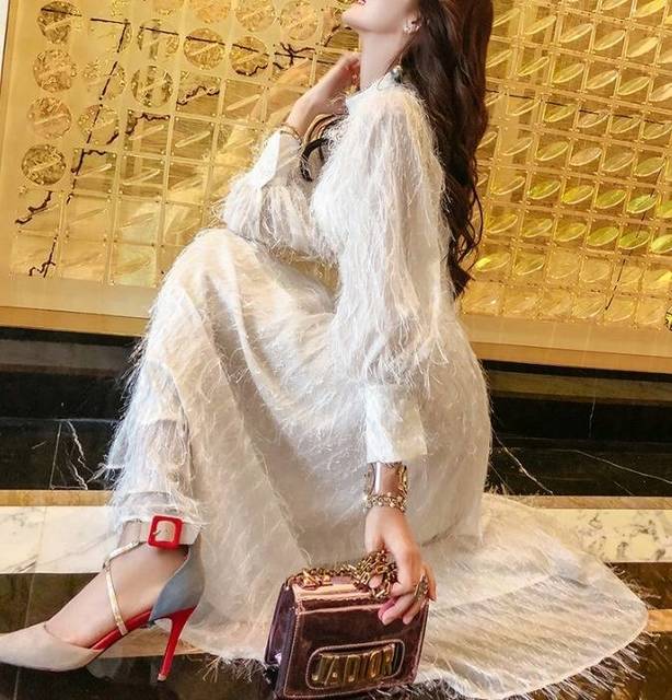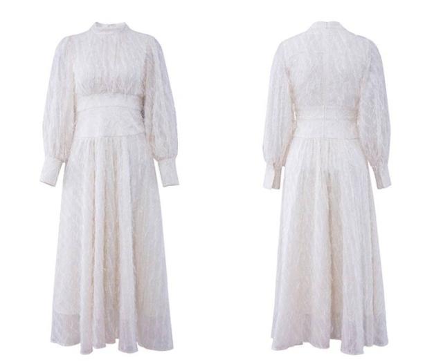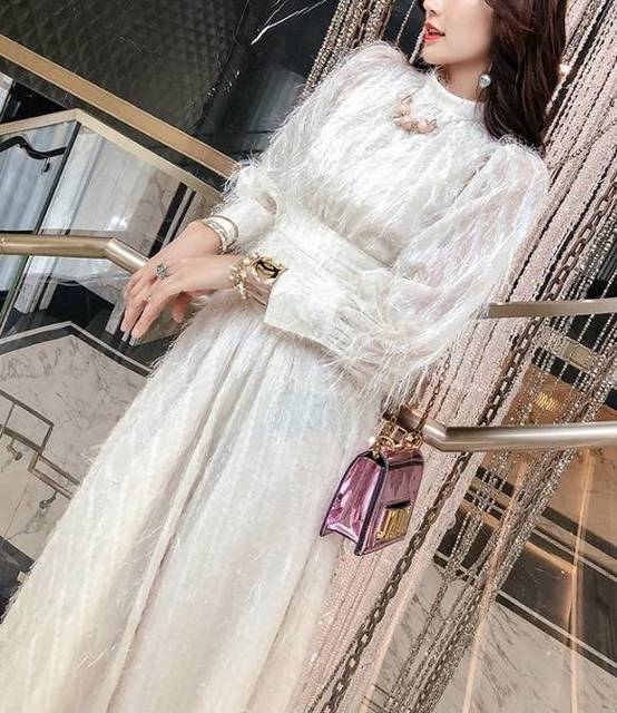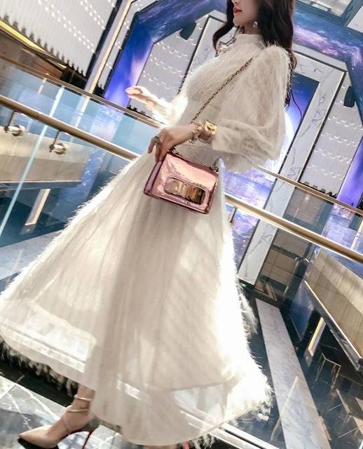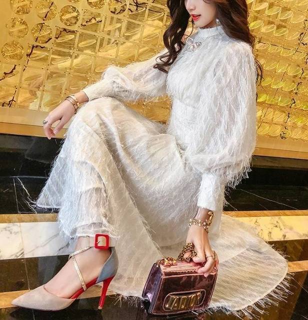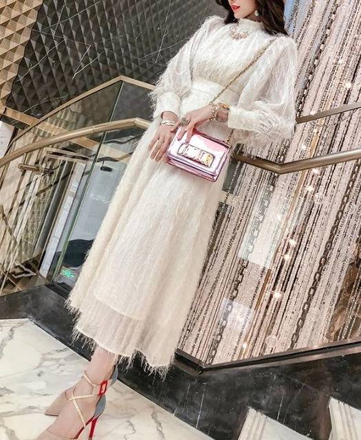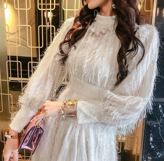 パーティードレス ハイネック 長袖 パフスリーブ ボリュームスリーブ イブニング フレアスカート シャギー Aライン ミモレ丈 エレガント