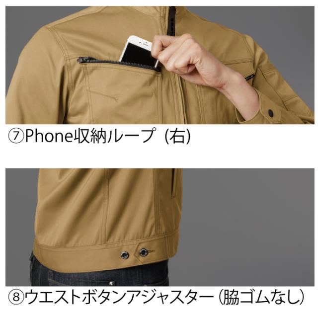 ◇機能:レベルブック・Phone収納ポケット(左・深さ20cm)、胸ペン差し(左)、袖ペンポケット(左)、袖アームタック、背アームノーフォーク、ウエスト釦アジャスター(脇ゴム無し)、Phone収納ループ(右)、内ポケット(左)