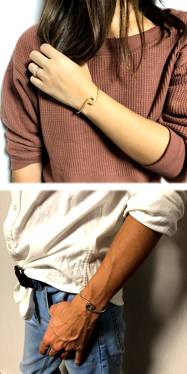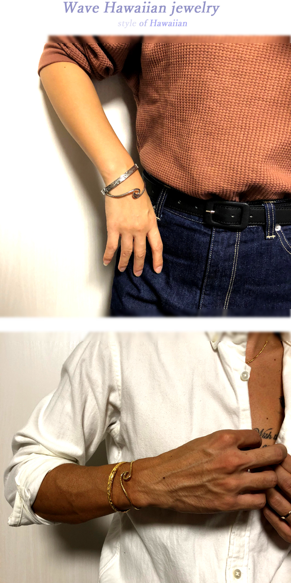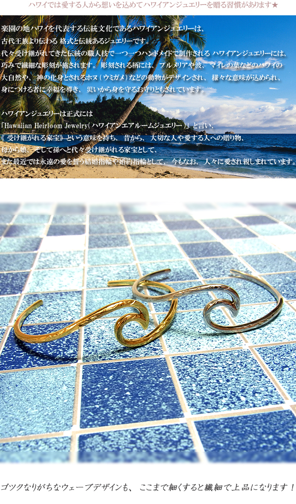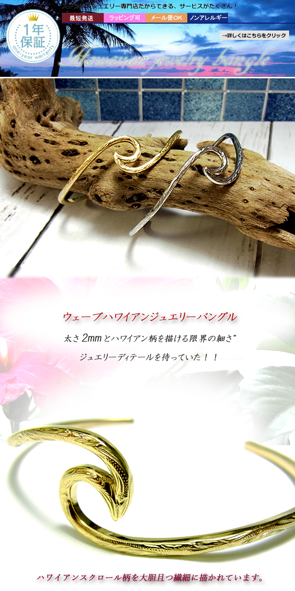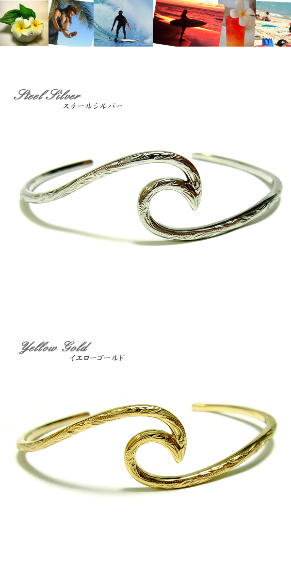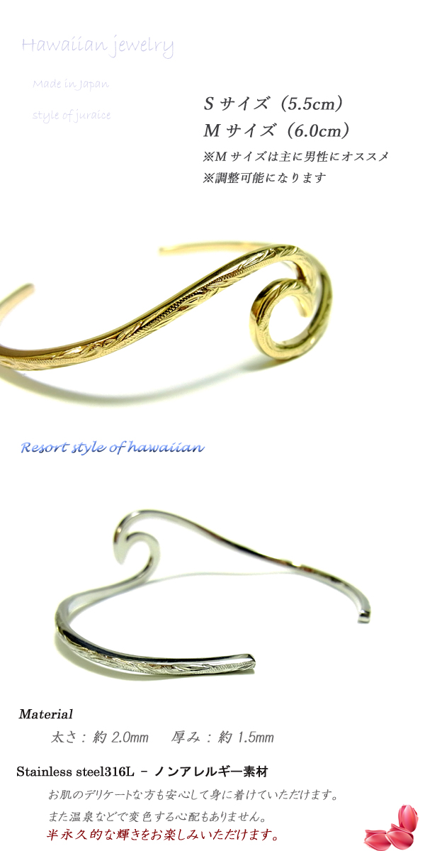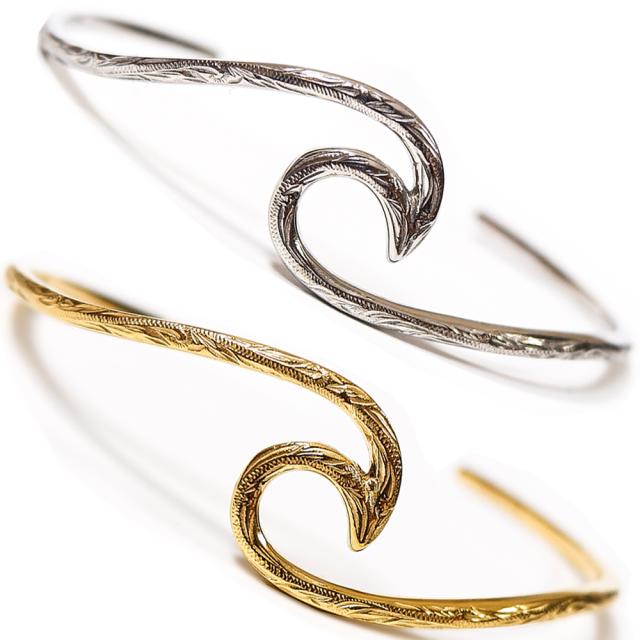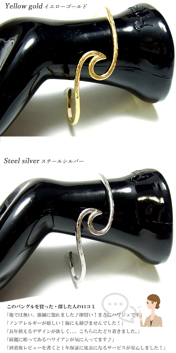 ハワイアンジュエリー バングル イエローゴールド シルバー サージカルスレンレス スクロール 波 レディース K14コーティング ラッピング対応 アレルギー対応