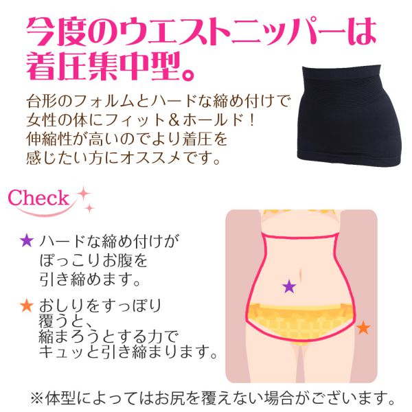 「瞬コル ウエストニッパーSP」:ウエストとヒップ上部を補正する着圧がハードな女性用インナーです。