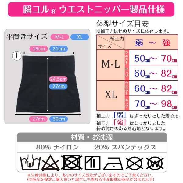 ■商品詳細 ■商品名 ウエストニッパーSP ■ブランド 瞬コル ■サイズ(目安) M-L ・ウエスト50cm‐70cm ・ヒップ60cm‐82cm XL ・ウエスト60cm‐82cm ・ヒップ70cm‐98cm ■カラー ブラック ■材質・仕様 ナイロン 80% スパンデックス 20% ・柔らかく伸縮性の高い素材を使用している為、体にしっかりとフィットします。 ・シンプルなデザインで男女兼用にてご利用できます。 ■ご注意・ご利用方法 ・柔らかい素材のため、直接地肌の上からも着用ができます。 ・着圧の強い商品です。気分が悪くなったり体調に変化があった場合は直ちにご利用を中止されてください。 |