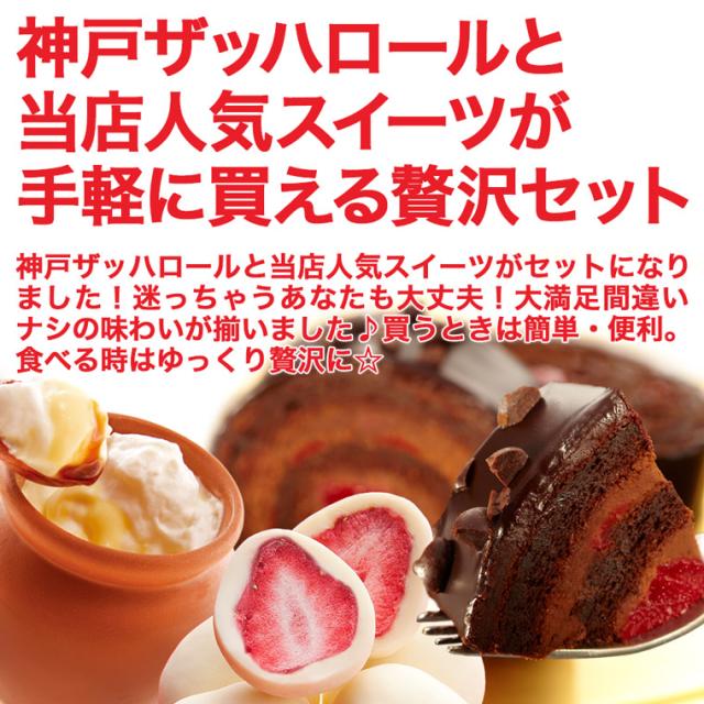 最高級のチョコレートを贅沢に使用したプレミアムロールケーキ「神戸ザッハロール」に、メディアで多数紹介、ふわとろ食感がたまらない「神戸魔法の壷プリン®」、苺ミルクの懐かしい味わい「神戸苺トリュフ®」がセットになりました!さっとつまめる苺トリュフ、食後のデザートに壷プリン、その後、おいしいお紅茶やワインとともにザッハロールでチョコレートの濃厚な味わいを楽しむ…なんていかがでしょうか?