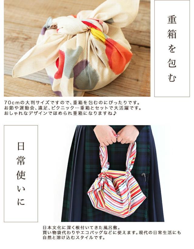 普段使いのふろしき「モダンガール」は、日常の小さなお祝いごとやプレゼントを包むラッピングアイテムとしてお使い頂けるシリーズです。70cmの大判サイズですので、重箱を包むのにぴったりです。お節や運動会、遠足、ピクニック…重箱とセットで大活躍です。おしゃれなデザインでほめられ重箱になりますね♪日本文化に深く根付いてきた風呂敷。買い物袋代わりやエコバッグなどに使えます。現代の日常生活にも自然と溶け込むスタイルです。お弁当を包んだり。バッグにしたり。ハンカチにしたり。衣類を包み分けたり。様々なシーンに合わせてお使い下さい。簡単に風呂敷バッグができる『ふろしきパッチン』も取り扱っています。風呂敷 ふろしき 風呂敷き モダンガール 70cm 綿100% ふろしき むす美 かわいい おしゃれ 和モダン お弁当 送料無料
