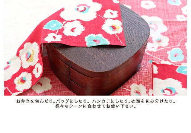 | 普段使いのふろしき「モダンガール」は、日常の小さなお祝いごとやプレゼントを包むラッピングアイテムとしてお使い頂けるシリーズです。70cmの大判サイズですので、重箱を包むのにぴったりです。お節や運動会、遠足、ピクニック…重箱とセットで大活躍です。おしゃれなデザインでほめられ重箱になりますね♪日本文化に深く根付いてきた風呂敷。買い物袋代わりやエコバッグなどに使えます。現代の日常生活にも自然と溶け込むスタイルです。お弁当を包んだり。バッグにしたり。ハンカチにしたり。衣類を包み分けたり。様々なシーンに合わせてお使い下さい。簡単に風呂敷バッグができる『ふろしきパッチン』も取り扱っています。 |