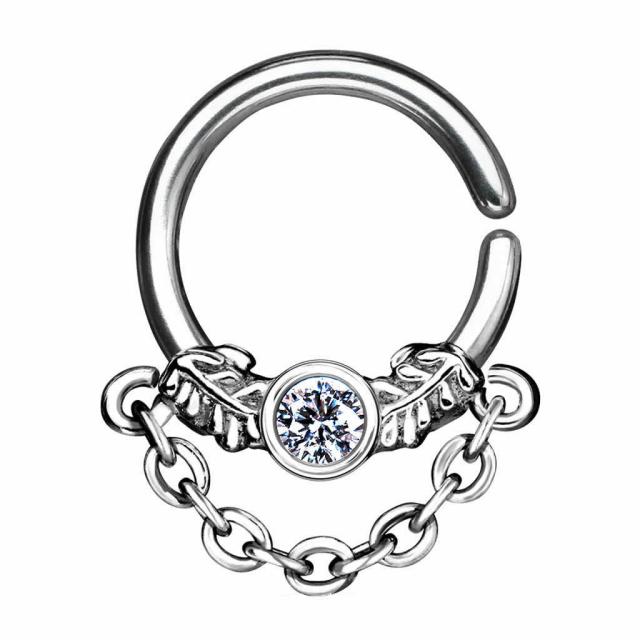 リング型のボディピアスに羽根とクリスタルと鎖ををデザインした16ゲージのシームレス型リング。メンズでもレディースでも使えるおしゃれボディーピアスはカップルコーデや、彼氏や彼女へのプレゼント、友達へのギフトにも最適。シャフトをツイストさせて装着するキャッチのないタイプのボディピアスは簡単装着でき、軟骨ピアスのヘリックスやトラガス、セプタムによく使われるボディピアスです。素材も安心のサージカルステンレス316L製。