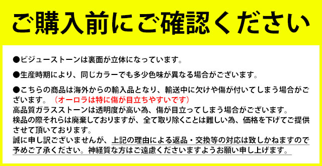 | ご注意 | ●ビジューストーンは裏面が立体になっています。 ●生産時期により、同じカラーでも多少色味が異なる場合がございます。 ●こちらの商品は海外からの輸入品となり、輸送中に裏面ホイルの剥げやストーンの欠け、小傷等が付いてしまう場合がございます。(オーロラは特に傷が目立ちやすいです) ●高品質ガラスストーンは透明度が高い為、傷が目立ってしまう場合がございます。検品の際それらは廃棄しておりますが、全て取り除くことは難しい為、価格を下げてご提供させて頂いております。誠に申し訳ございませんが、上記の理由による返品・交換等の対応は致しかねますので予めご了承ください。神経質な方はご遠慮くださいますようお願い申し上げます。 ●商品画像はイメージです。モニター環境により、実際の商品の色合いとは多少異なって見える場合がございます。 ●スワロフスキー、プレシオサではございません。 ●商品到着後は不具合がないかご確認ください。いかなる理由でも到着後7日以上経過した商品の保証はございません。また、一度でも使用した商品の返品・交換はお受け出来ませんので、必ず商品ご使用前にご確認ください。 ●商品到着後、お客様の元で破損・故障・汚れ・不備が生じた場合は、返品・交換等の対応は致しかねますので予めご了承ください。 ●この商品は海外からの輸入品の為、輸送中に傷が付くことがございます。 ●入荷時期により仕様の変更がある場合がございます。 ●予約販売とは、メーカーから取り寄せをおこなっている入荷待ちの商品です。予約販売の納期はシステム上表記されていない場合がございますが、3週間から5週間程度お時間を頂いております。ご了承ください。 ●当該商品は自社販売と在庫を共有している為、在庫更新のタイミングにより、在庫切れの場合やむをえずキャンセルさせて頂く可能性がございます。 |