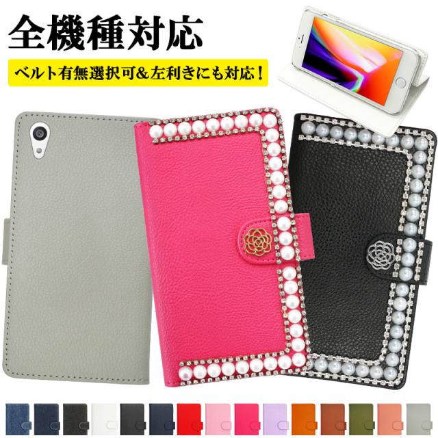 スマホケース 手帳型 全機種対応【レザーorデニム×パール/カメリアビジューデコケース】メール便送料無料 受注生産