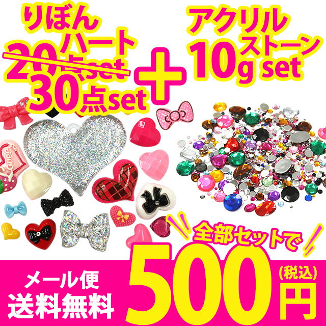 【ハート・りぼんデコプラパーツ30個+アクリルストーン10g】色々試せてお得♪メール便送料無料【パーツ】