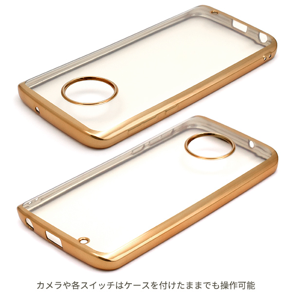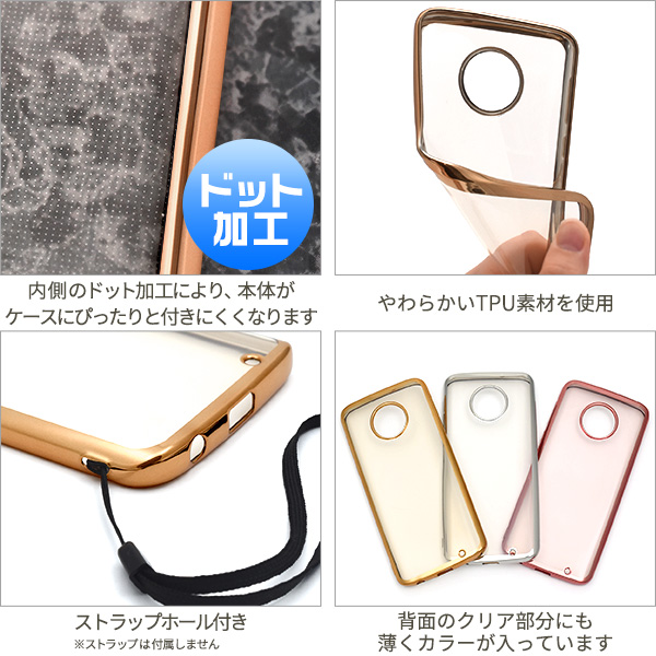 Moto G6 Plus用のメタリックバンパーソフトクリアケース。背面はクリア、バンパー部分やフチはメタリックのケースです。衝撃やキズなどからスマートフォンを守るのはもちろん、カメラ、イヤホンや各種ボタンなどをケースに入れたまま操作可能です。 また、落下防止に便利なストラップホール付きです。ケース内側のドット加工処理により、本体がケースにぴったりと付くのが解消され、ケースが装着しやすくなります。