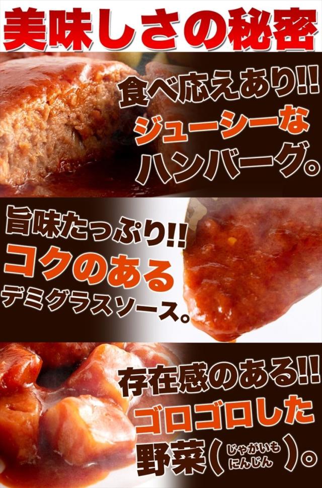 ■本格的煮込みハンバーグが簡単に食べられる!!1人暮らしの方 主婦の皆様など必見です!!●お湯で温める場合は、袋の封を切らずに熱湯の中に入れ、7〜8分間沸騰させて温めてください。●電子レンジで温める場合は、袋を開けて耐熱容器に移し替え、ラップをかけて加熱してください・お荷物のお届け ポスト投函宅急便とは異なり、ご自宅のポスト、宅配ボックスにお入れしてお届けします。手渡し・不在票の投函はできません。予めご了承ください。・発送後の送り状番号なしゆうメール便は、発送後の送り状Noが存在しない為、お伝えできません。万が一、ご注文後10営業日たっても届かなければご連絡下さい。・お届け日時・時間帯の指定不可ご希望のお届け日時や配送時間帯の指定はできません。■賞味期限:約2ヶ月〜半年■名称:そうざい(野菜入りデミハンバーグ)■原材料名:ハンバーグ、野菜[玉ねぎ、じゃがいも(遺伝子組み換えでない)、人参、生姜、にんにく]、トマトペースト、豚脂、小麦粉、還元水あめ、デミグラスソースベース、ビーフエキス、食塩、全脂粉乳、トマトケチャップ、ウスターソース、しょうゆ、香辛料、加工でん粉、調味料(アミノ酸等)、...