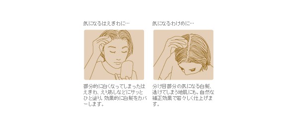 使用方法 | パフに適量をとり、白髪の気になる部分に塗布します。 | ||
