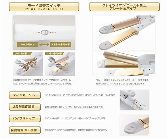 本体裏側にあるモード切替スイッチで簡単にカールやストレートなど、シーンやその日の気分に合わせてスタイルチェンジが可能。プレート表面にクレイツイオンゴールド加工を採用。髪滑りが良く、ツヤのあるしなやかな髪に仕上げます。ハンドル部分には、アイロン操作がしやすく滑りにくいフィンガーリムを採用。髪質に合わせて150℃・170℃・190℃の3段階で温度調節が可能。アイロン先端部には、手を添えやすい長めのパイプキャップを採用。