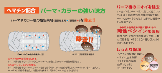 【ハホニコ ラメイ ヘアクレンジング】 デイリークレンジングヘマチン配合 パーマ・カラーヘアに■パーマ後のニオイを除去メルカプト臭 (パーマ臭)に対してはクロロフィル以上の消臭効果が確認されており、 パーマ、カラー をされる方には特に相性のよい製品です。 ■両性ベタインを使用両性ベタイン型の洗浄成分を使用し、傷んだ髪を傷つけることなく優しくしっかり洗いあげます。■しっとり保湿ヘマチンの保湿の他にも、ベタイン、加水分解ケラチン等の保湿効果でしっとり仕上がります。ハホニコ シャンプー