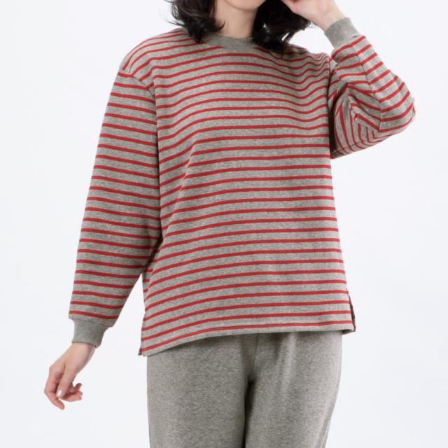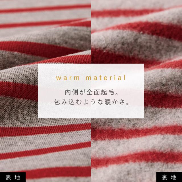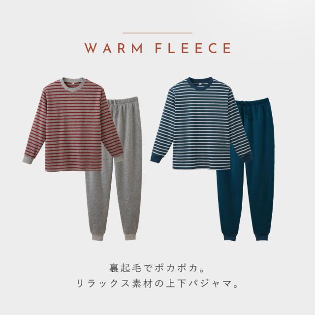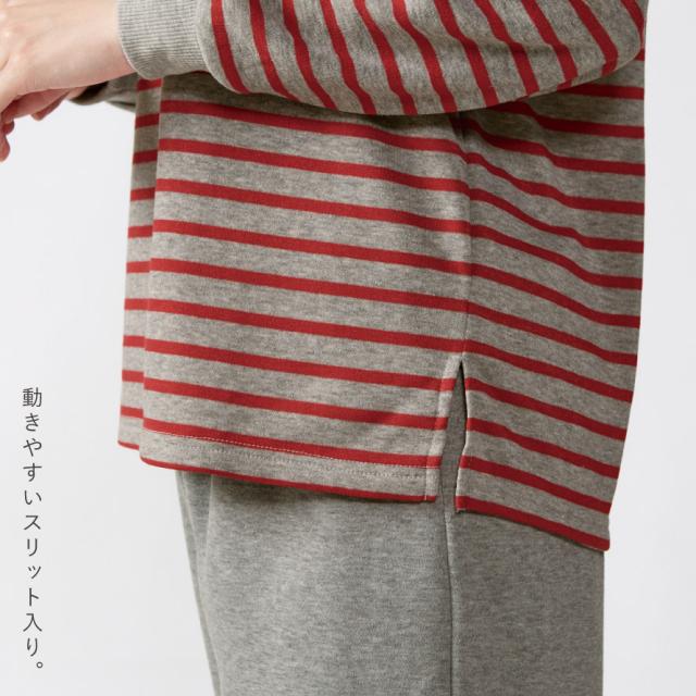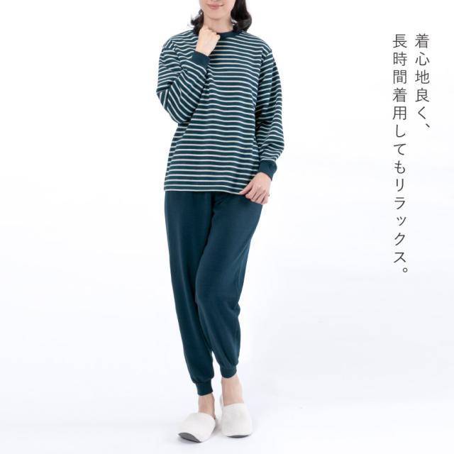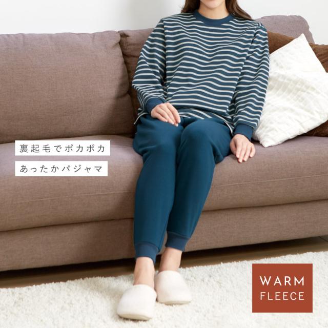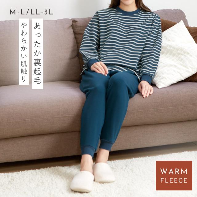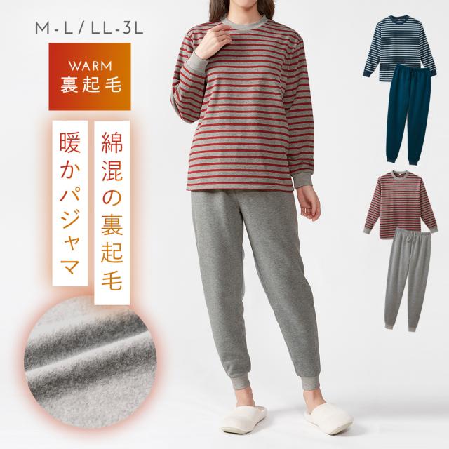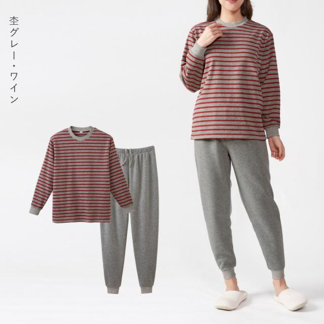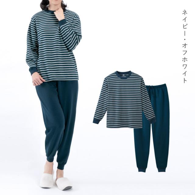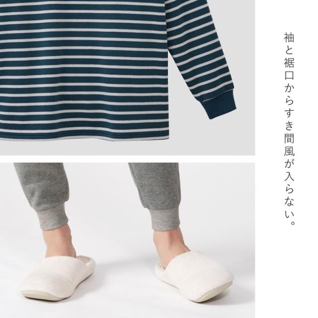 綿混の裏起毛であったか!ボーダー柄の長袖トレーナーと無地のパンツの上下セットのパジャマ。内側が全て起毛でポカポカ。肌ざわり柔らかで暖かく寒い季節におすすめです。