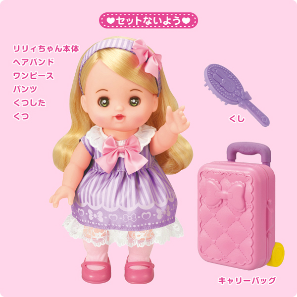 リリィちゃん本体(パンツ付)、ヘアバンド、ワンピース、くつした、くつ、ブラシ、キャリーバッグ