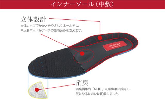 中足骨パット付きの立体成型インソールが安定感のある履き心地を実現。
