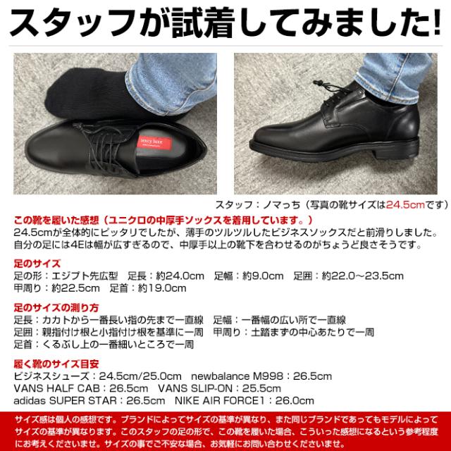 いつも履くビジネスシューズ(26.5cm 3E)よりワンサイズダウンの26.0cmでピッタリでした。